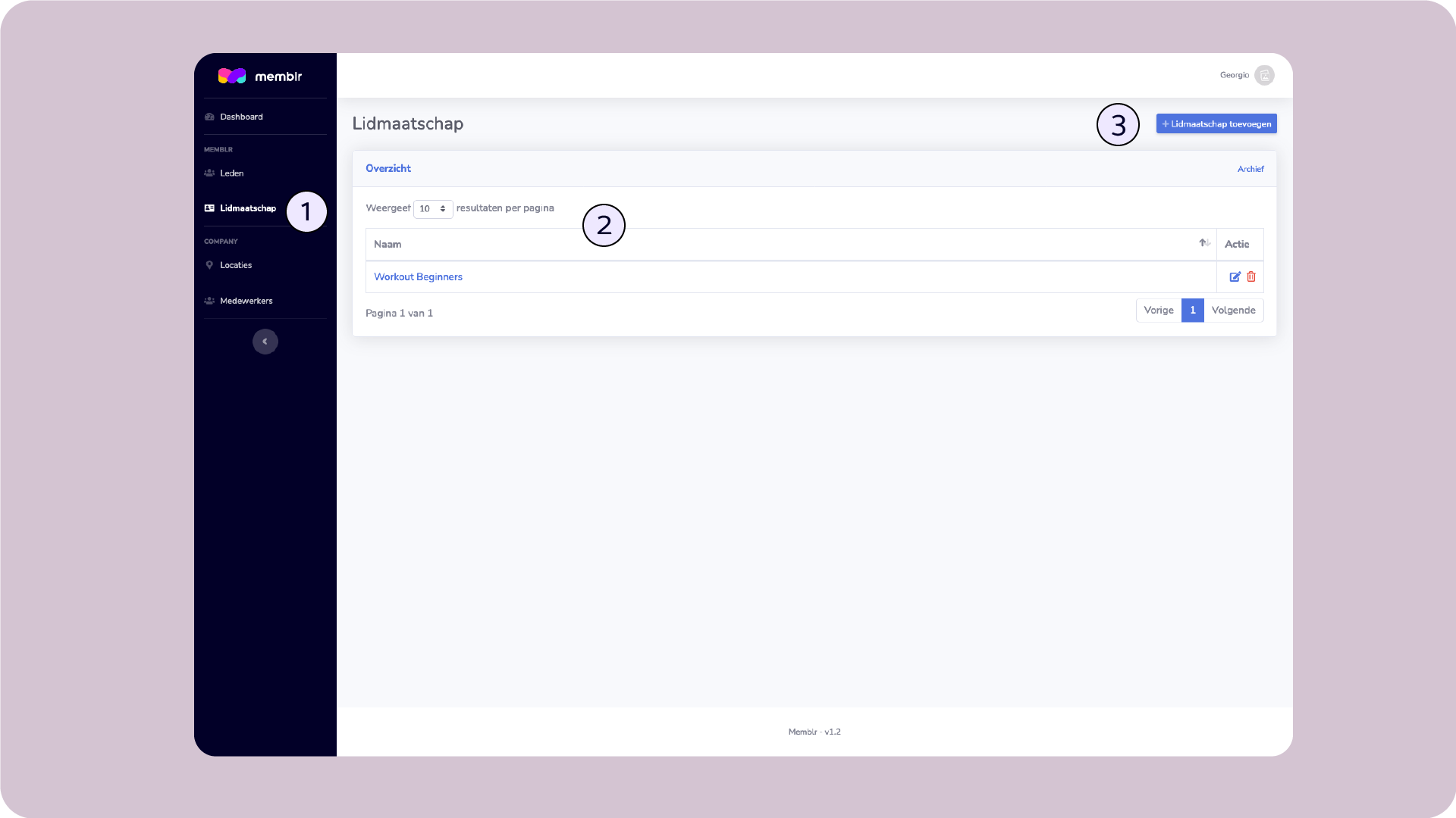 Through our dashboard you'll be able to create memberships that your company wants to provide. From the menu you'll have to navigate to "Membership" (1), then you will be presented with all your company memberships. Here you'll be able to edit (2) or create (3) new memberships.