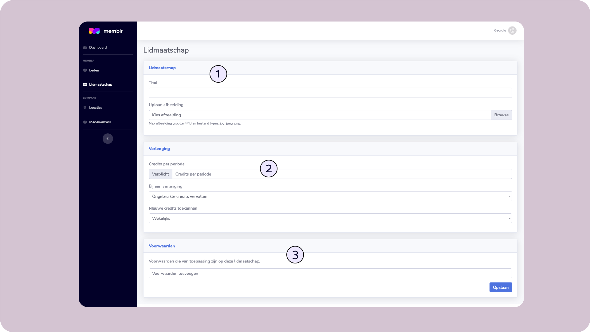 When you're adding or editing a membership, you'll be provided with a couple of fields to configure the membership. In the section membership (1) you'll configure the name and image of the membership. In the next section (2) you can configure the renewal conditions such as the amount of credits, period of membership and what happens to the credits on renewal. And you're also able to add terms and conditions (3) which the customer can see in the app.